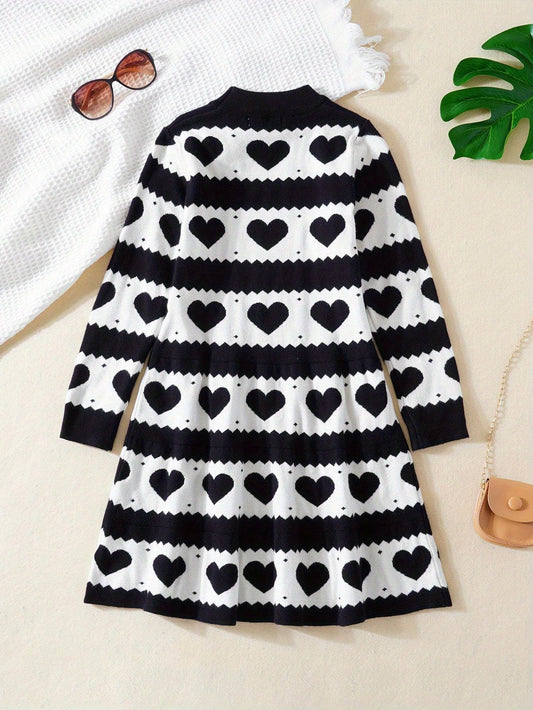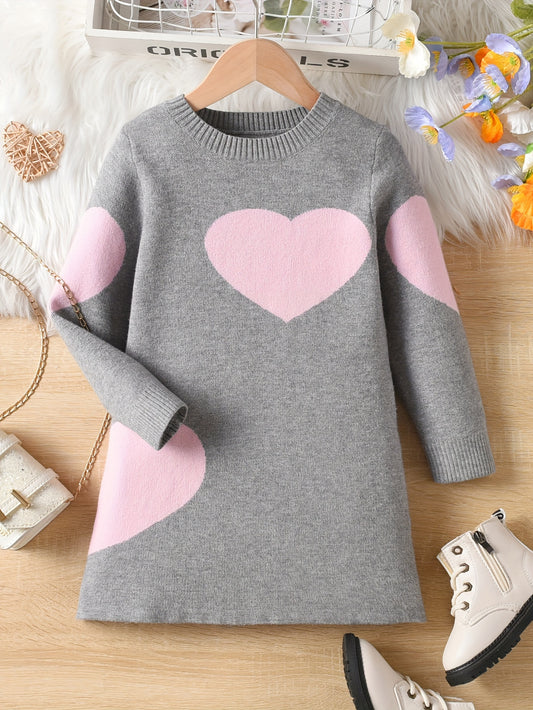 Long Sleeve Girls Warm & Comfy Hearts Pattern Knitted Sweater Dress for Spring & Fall