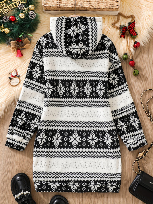 Long Fleece Girls Vintage Snowflake Striped Pattern Hooded Sweatshirt for Christmas Fall and Winter