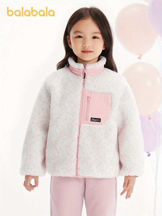 Balabala Girls' Cozy Fleece-Lined Color Block Jacket - Casual Zip-Up, Stand Collar, Machine Washable, Polyester - Perfect for Fall/Winter