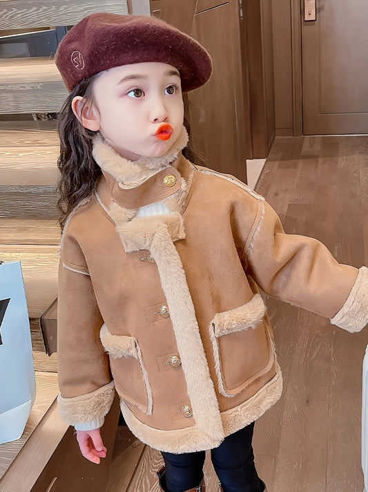 Versatile Girls' Cute Collared Solid Coat Jacket - Elegant Button Decor, Warm, Water-Resistant, and Breathable for Fall and Winter - Kids' Fashionable Outerwear for Casual Daily Wear and Special Occasions