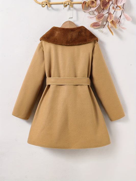 Chic Vintage-Inspired Girls' Double-Breasted Fleece-Blend Coat with Belt - Polyester, Non-Stretch, Solid Color, Knit Fabric, Perfect for Winter - Cozy & Stylish Outerwear