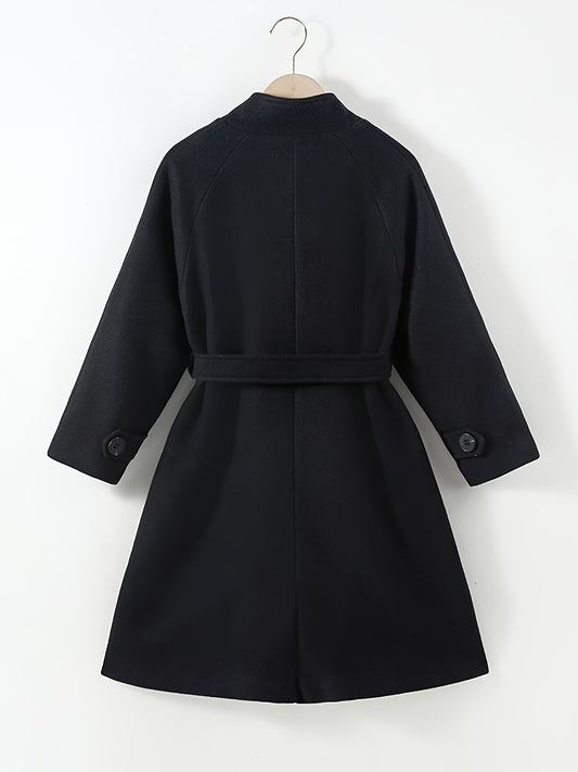 Girls' Classic Long Trench Coat With Belt - Long Sleeve Cheongsam Collar Elegant Outerwear
