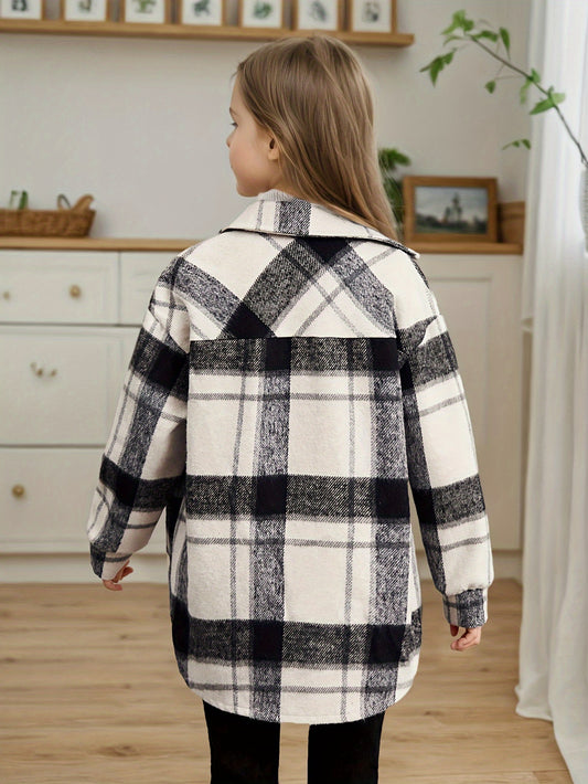 Girls' Fashionable Corduroy Coat - Long Sleeve, Plaid Pattern, Button-Up, Pockets, Water-Resistant, Warm, and Stylish for Spring, Fall, and Winter Outdoor Activities