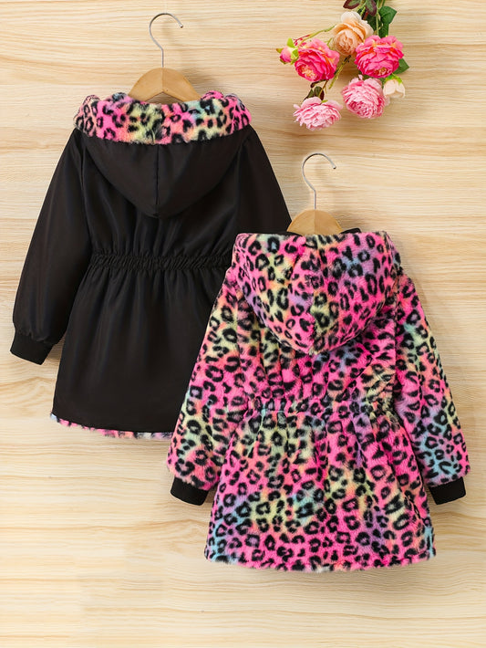 Cute Colorful Leopard Print Hooded Tunic Coat for Girls – Reversible Long Sleeve Outerwear