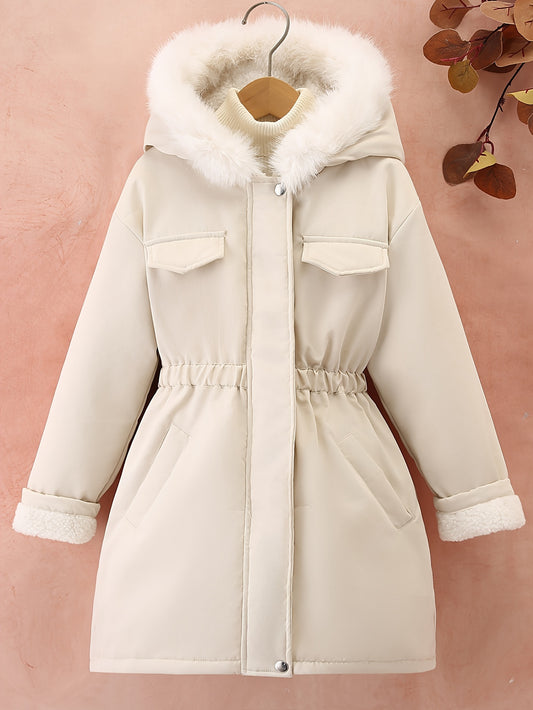 Thick Fleece-lined Girls Elegant Mid-length Jacket with Furry Collar, Hooded, Solid Color, Elastic Waist, All-match