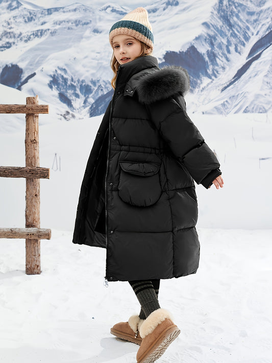 Girls Winter Long Hooded Coat With Large Pockets, Elegant Style Furry Hooded Coldproof Long Snow Suits
