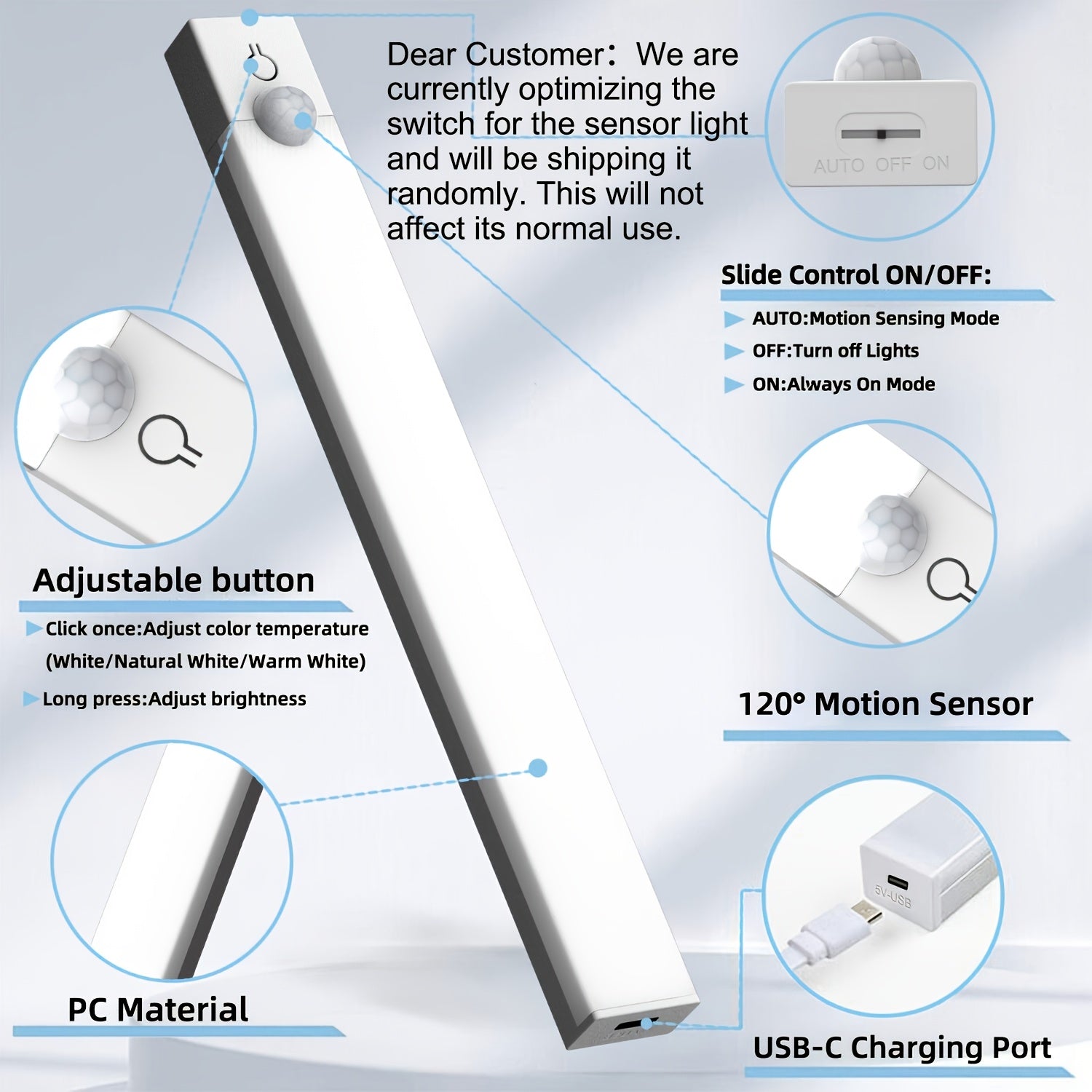 Set of 3 LED Lights with Motion Detection - Adjustable Brightness for Cabinets, Rechargeable Via USB, Featuring Three Color Temperatures (3000K/4500K/6000K), Suitable for Use As Night Lights in Bedrooms, Staircases, Kitchens,