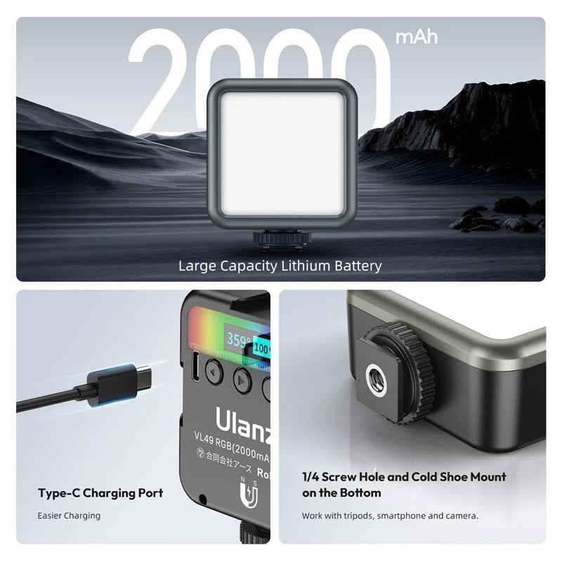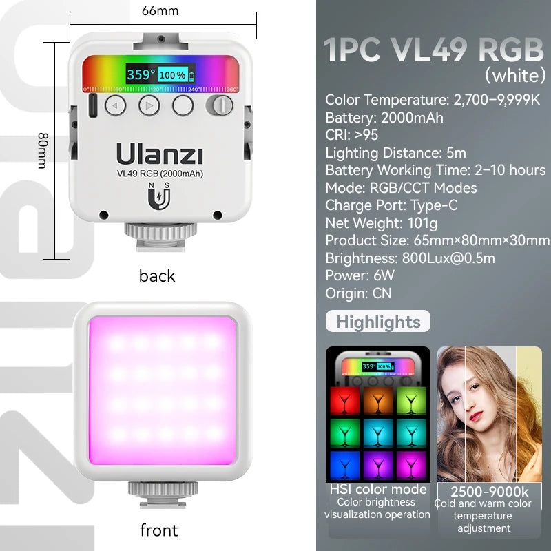 The Ulanzi VL49RGB Full-Color LED Video Light is a compact, powerful RGB mini fill light made for creators who shoot video, photos, livestreams, interviews, product shots, and content on the go. It delivers flexible lighting control for any scene whether you need warm tones, cool daylight balance, or colorful RGB effects for a modern look.